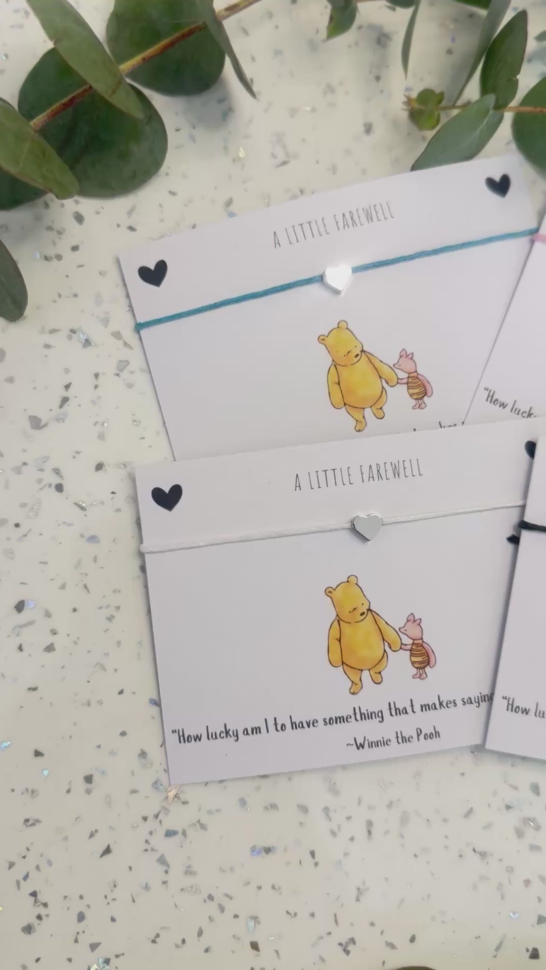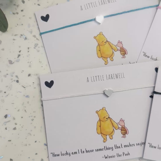 Sweet dainty string bracelet with heart bead mounted on classic pooh quote card.